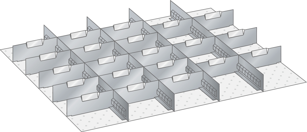 Plaquettes séparatrices : Combinées avec les parois à fentes, elles permettent une subdivision fine quelconque du tiroir. La zone d'étiquetage est coudée sur toute la largeur pour loger les porte-étiquettes ou les supports de codes-barres. Le pli inférieur vers l'avant permet un vissage des plaquettes séparatrices sur le fond perforé des tiroirs. Les dimensions sont gravées sur chaque plaquette séparatrice. Exécution : aluminium.