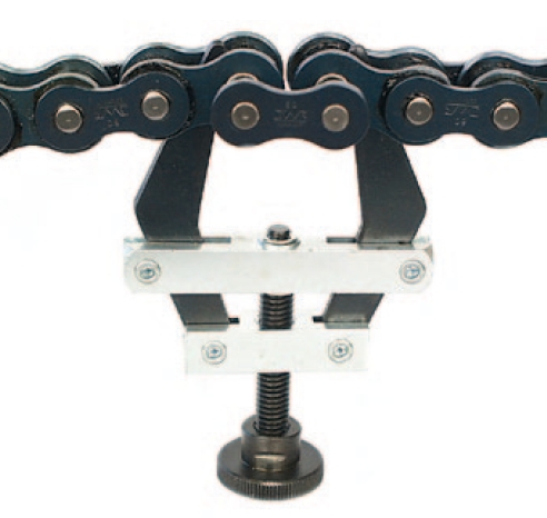 La pince de l'outil est engagée sur le maillon intérieur de la chaîne et l'axe est extrait de la plaque extérieure.