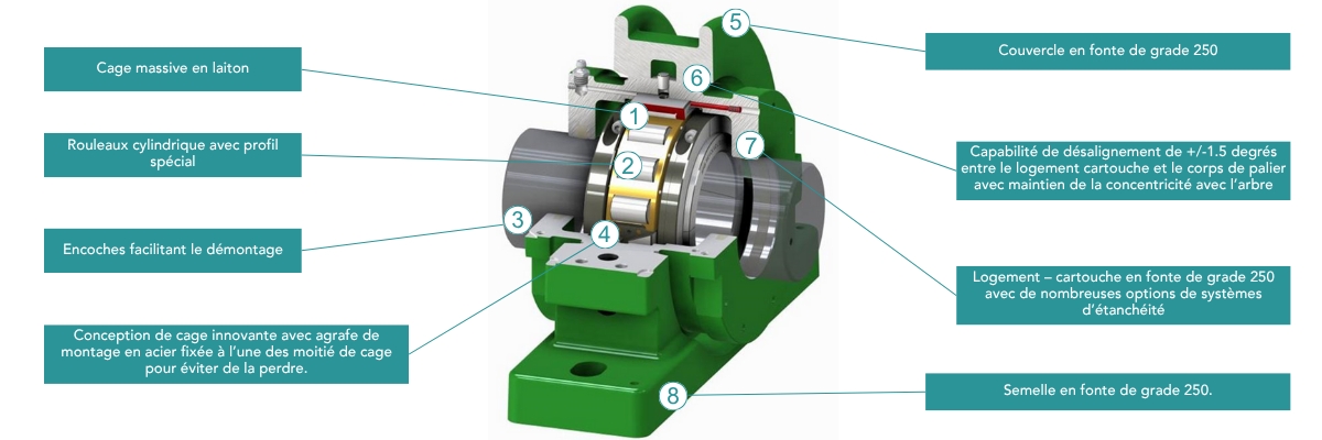 - Réduit les manipulations et permet de raccourcir les arrêts machine lors d’un remplacement de paliers.