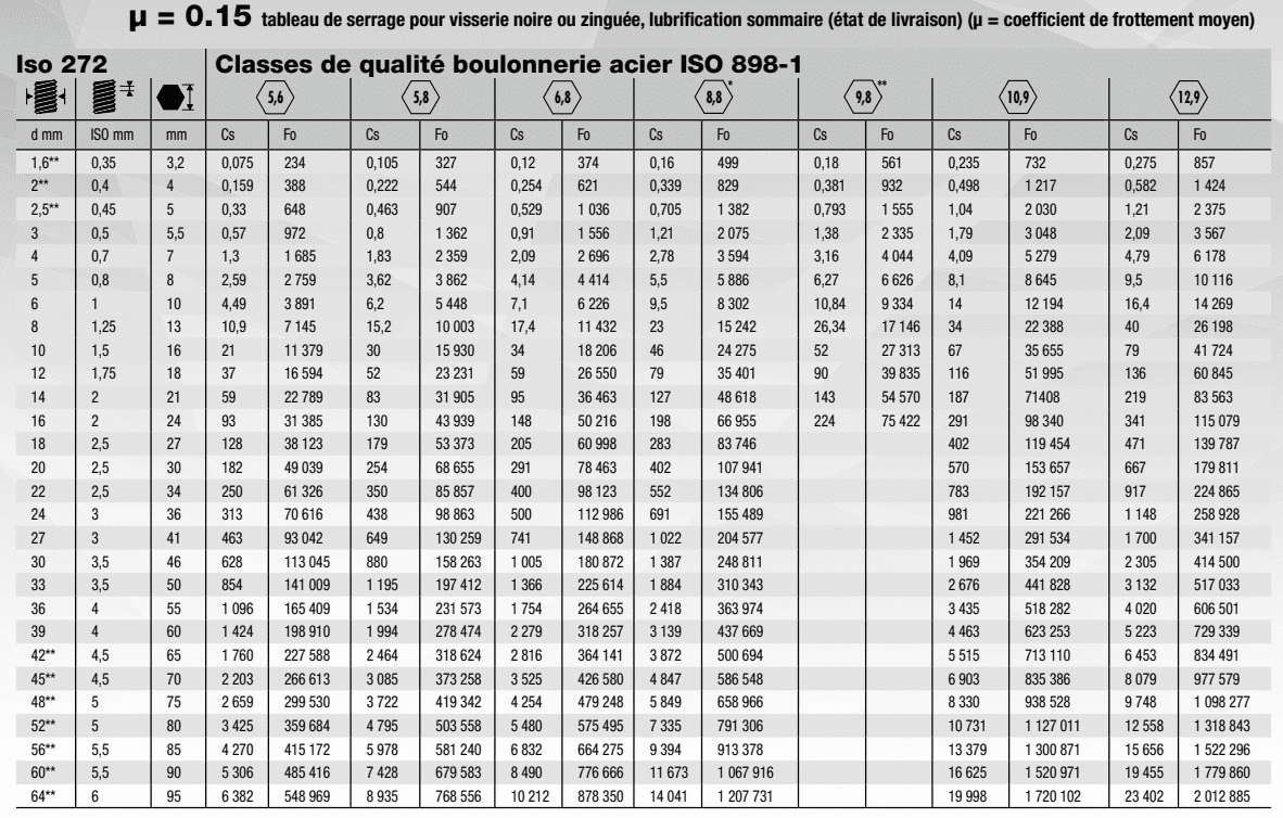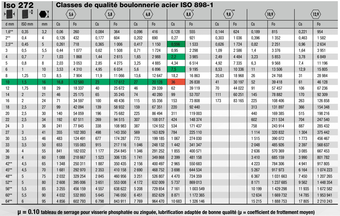 Les caractéristiques des vis dépendent de leur classe de qualité (les vis 12.9 étant «-les plus performantes-»). Choisir la colonne correspondant à la classe de votre vis. Exemple : vis d 10, qualité de vis
